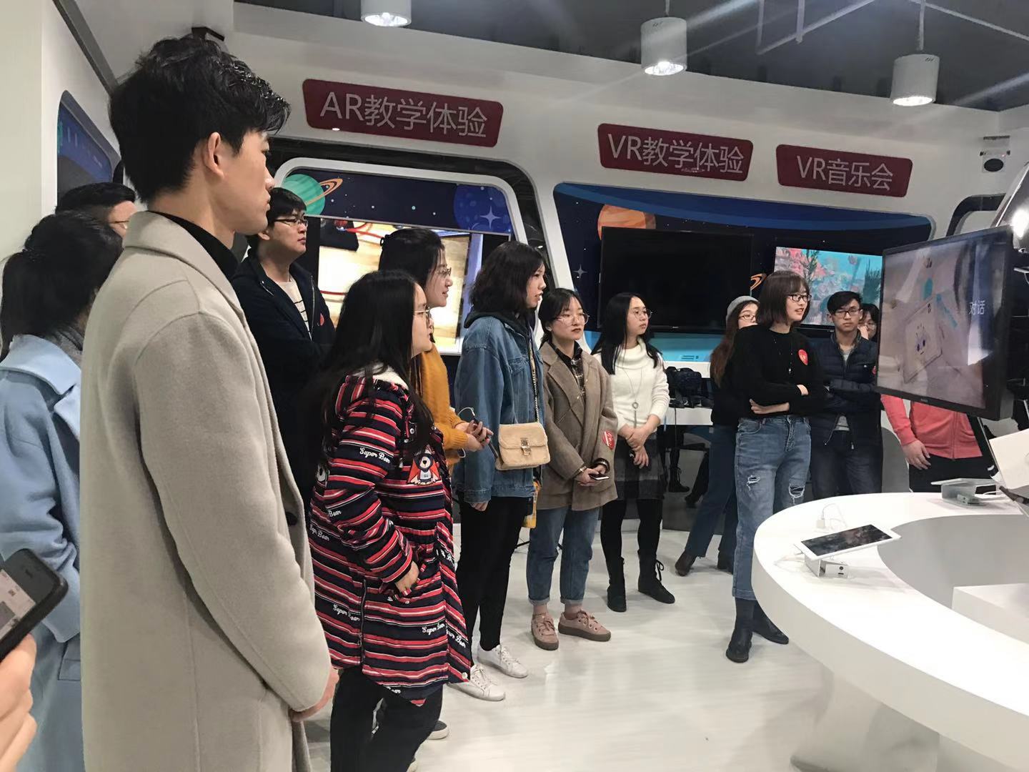 下午2时,全体同学抵达学而思网校办公区。首先,同学们在引导员的带领下在人工智能展厅参观体验。同学们依次了解了人工智能普通话教学、虚拟现实教学、增强现实教学等先进的教学设备和软件 ,并在展台前驻足体验。