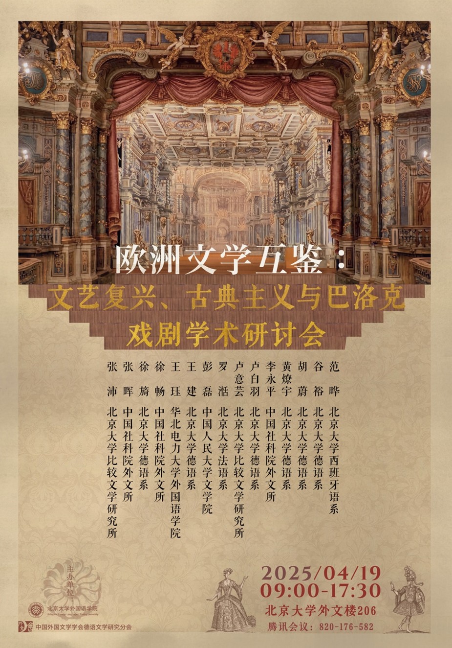 2025年4月19日,“欧洲文学互鉴:文艺复兴、古典主义与巴洛克戏剧学术研讨会”在德赢vwin体育官网外文楼成功举办。本次会议由德赢vwin体育官网和中国外国文学学会德语文学研究分会联合主办,吸引了来自德赢vwin体育官网多个院系以及中国社会科学院外国文学研究所、北京外国语大学、中国人民大学、华北电力大学等高校和科研单位的众多师生积极参与,场面热烈,反响盛大。