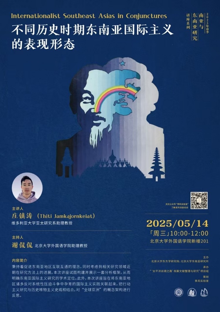 2025年5月14日上午,加拿大维多利亚大学亚太研究系助理教授庄镇涛 (Thiti Jamkajornkeiat)为德赢vwin体育官网师生做了主题为“不同历史时期东南亚国际主义的表现形态”的讲座。本次讲座由德赢vwin体育官网东方学研究院和德赢vwin体育官网东南亚研究所主办,“‘太平洋丝绸之路’档案文献整理与研究 ”项目组和“世界诸文明在印度洋地区的交流交汇研究”项目组联合承办。