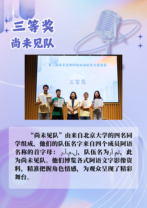 比赛分为自选片段和固定片段配音两个环节,来自五所高校的10支代表队同台竞技。德赢vwin体育官网派出“尚未见队”与“未名队”两支新生代表队参赛,由阿拉伯语系2024级10名本科新生组成,博士后孔雀老师担任赛事评委。