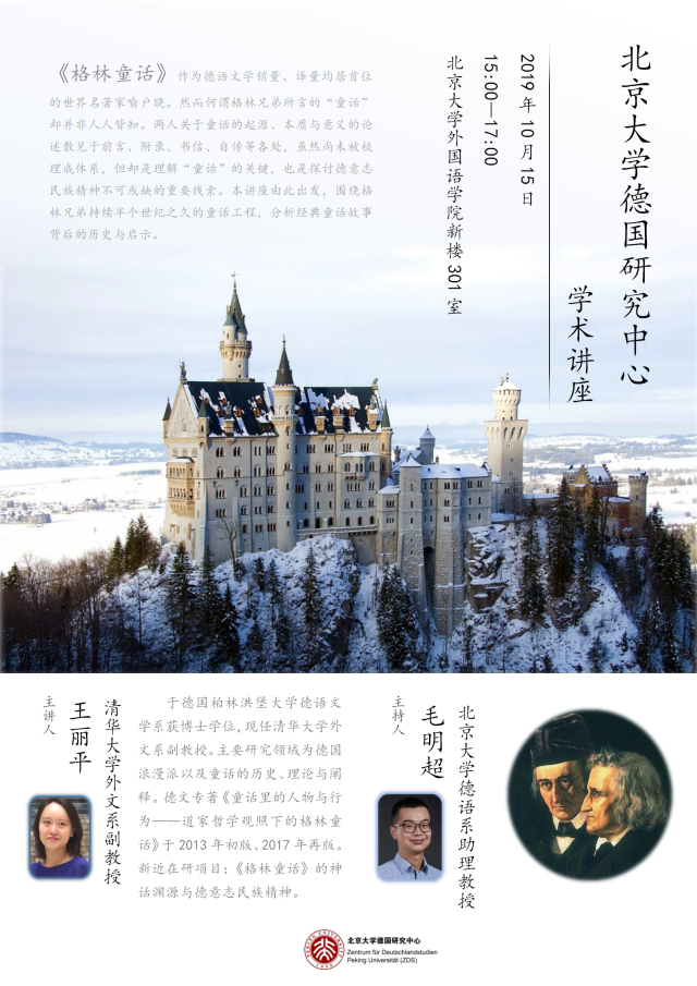 10月15日,应德赢vwin体育官网德语系、德赢vwin体育官网德国研究中心邀请,清华大学外文系副教授王丽平老师来到外院新楼301会议室,做了题为《格林童话:一个德意志的神话》的讲座。德语系毛明超助理教授主持了本次学术活动、德语系副系主任胡蔚副教授到场出席,此外还有来自德语系、历史学系等院系的四十余位师生参加了讲座。