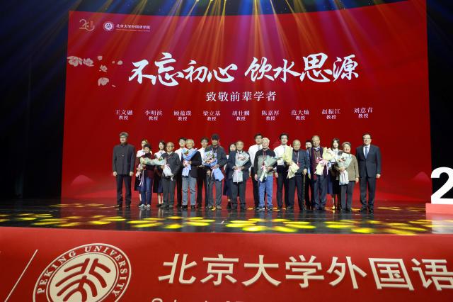 学生原创诗朗诵《外院学子说》拉开了大会序幕。在“不忘初心 饮水思源”的特别环节,郝平、王博和学生代表们向外语学科前辈学者献花,全体参会人员用热烈的掌声向他们致敬,感谢他们为外语学科的建设和外语人才的培养所作出的杰出贡献。