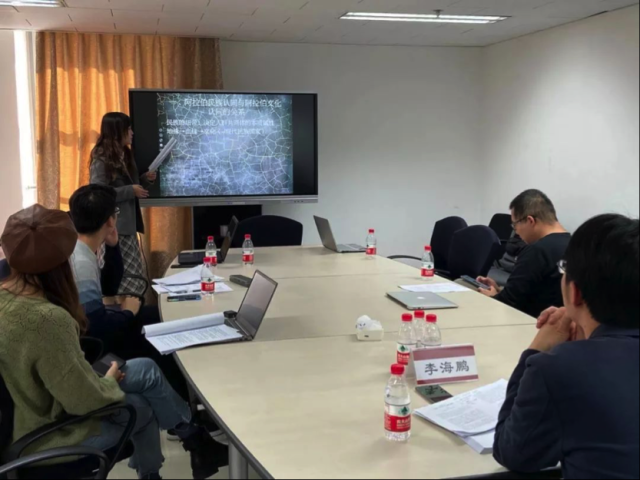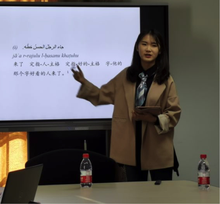 第三时段的研讨由德赢vwin体育官网硕士研究生曹雨婷主持,德赢vwin体育官网阿拉伯语系付志明教授评议。德赢vwin体育官网博士研究生白野、天津外国语大学硕士研究生周霍天航、大连外国语大学硕士研究生侯英杰和对外经济贸易大学潘羽婕分别以《近现代阿拉伯语言学家对“闪米特语”概念的立场转变》、《阿拉伯语汉语发展历史的对比及浅析》、《阿汉基本颜色词“红”的民族文化内涵比较》和《台木尔短篇小说〈人寿保险〉中的现实主义风格解读》为题进行了发言。付老师充分肯定了几位同学的选题意义,同时强调,对研究问题进行文献回顾时,要做细致全面的考察,本领域内知名学者的研究不可忽视。此外,文化语言学、语言发展史都涉及语言学词汇学、语音学、语义学、民俗学宗教学等多个学科,选题过大、过宽会影响论文的深度与针对性。