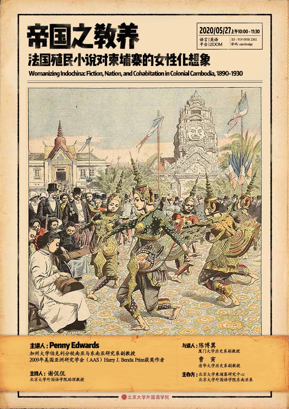 2020年5月27日,世界著名东南亚研究学者、加州大学伯克利分校南亚与东南亚研究系副教授Penny Edwards为外院师生进行了一场在线讲座,主题为“帝国之教养:法国殖民小说对柬埔寨的女性化想象”。讲座由德赢vwin体育官网柬埔寨研究中心和外院东南亚系主办,谢侃侃博士主持,相关院系及兄弟院校的数十名师生参加了此次在线研讨。
