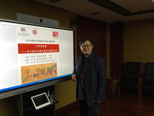 10月27日下午,赵宪章教授以“文学书像论——语言艺术与书写艺术的图像关系”为题进行了讲座,这也是赵教授此次北京之行的最后一场活动。赵宪章教授围绕“书像”概念的提出和意义;语象•字像•书像;以及书像之书意及其文意如影三个部分展开。赵教授指出,文学是语言的艺术,也可以延异为书写的艺术,“语象”“字像”和“书像”串联起两种艺术的图像关系,基于这种关系的理论批评即是“文学书像论”。当面对文学写本时,关注字像还是关注书像决定了它可能被视为语言艺术还是图像艺术。就这一点而言,“实用-艺术”二分法并不能有效回应“书写何以成为艺术”这一问题。此外,语象延异为字像,字像被存储在了记忆中,书写则使语言成为了可见的。被书写的字像就是书像,被欣赏的书像就是艺术。语象、字像和书像是异质同构,前者依次孕育后者并隐匿在了后者的肉身中,由此奠定了“文学书像论”的学理基础。而语象作为书像的母体,决定了后者表现前者之可能,具体显现为书像“图说”文意而生成书意,于是出现了书意和文意的唱和。赵教授认为,“文学书像”既是传统文学图像的典型样式之一,也是一种非常独特的文学图像,这主要是因为书像与语象、字象的直接联通,以及书意和语义、字义的错彩交融。在这一意义上,如果说绘画等图像是“存在的薄皮”,那么书像则是“存在的家园”,堪称“中国美术之冠”。赵老师殷切地希望,学者们能够共同重新认识、重新定义语图关系的新模态,如此将有助于学界引进新知和现代理性,遏制中国书论在经验层面的长期滑行。