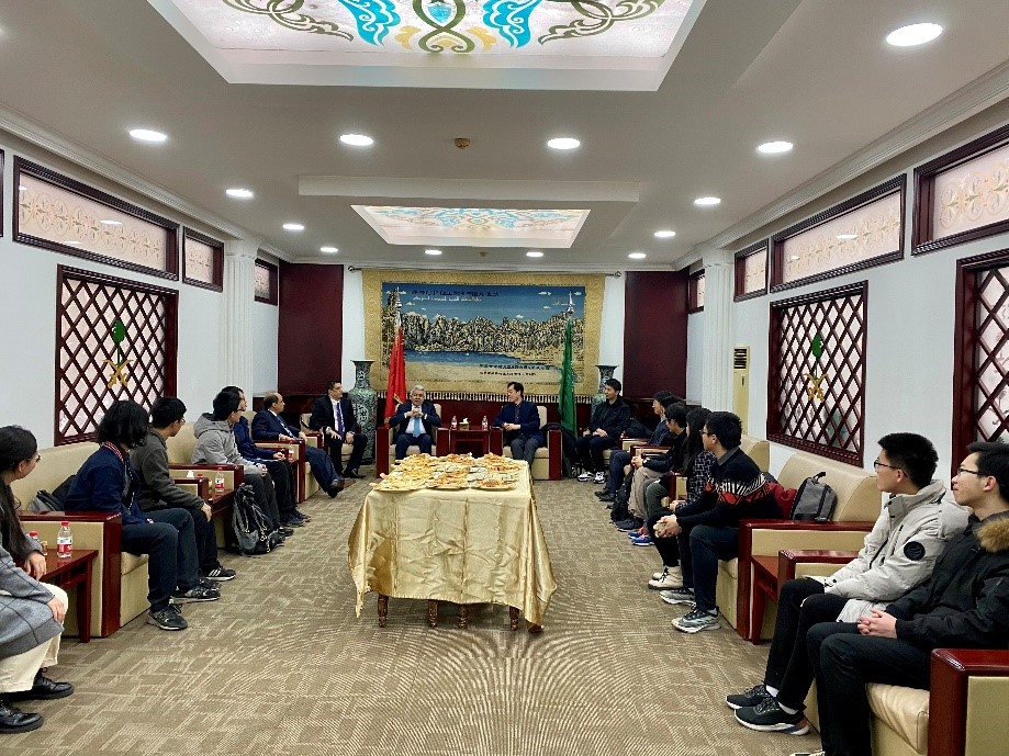 首先,艾勒马迪大使和师生代表团在使馆客厅内会谈。付志明老师首先代表师生感谢大使阁下的邀请,并表达了对中沙友谊的祝愿。随后,同学们就学习中遇到的困惑向大使踊跃提问。大使耐心地回答了同学们关于沙特2030愿景、石油问题、文化保护问题等热点话题的疑问,和大家展开互动。当提到中沙青年交流时,大使和在座的文化参赞热情洋溢地说起先前中沙青年交流的项目,并表示期待更密切的中沙青年交流。席间,大使用自己的个人经历和体会勉励同学们要不断思考、多问问题。王佩鸣、夏铁木还获得了大使赠书,两位同学表示将和大伙儿一起,在感兴趣的领域努力钻研、不断进步。