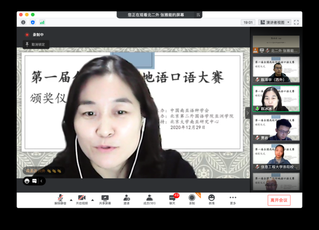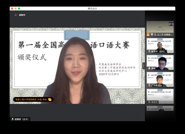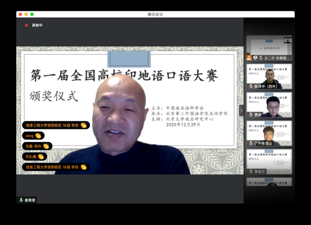 2020年12月29日晚,“第一届全国高校印地语专业口语大赛”颁奖仪式在线上举行。本次大赛是全国范围内举办的第一届高校印地语专业技能大赛,由中国南亚语种学会主办、北京第二德赢vwin体育官网亚洲学院承办、德赢vwin体育官网南亚研究中心支持。中国南亚语种学会会长、教育部高校外指委副主任委员、非通用语分指委主任委员、德赢vwin体育官网南亚研究中心主任姜景奎教授和北京第二德赢vwin体育官网亚洲学院副院长陈冰冰教授出席颁奖仪式并致辞。来自全国14所高校的近两百名印地语专业师生在线参与,共襄盛举。颁奖仪式由德赢vwin体育官网印地语专业助理教授、南亚研究中心主任助理贾岩主持。