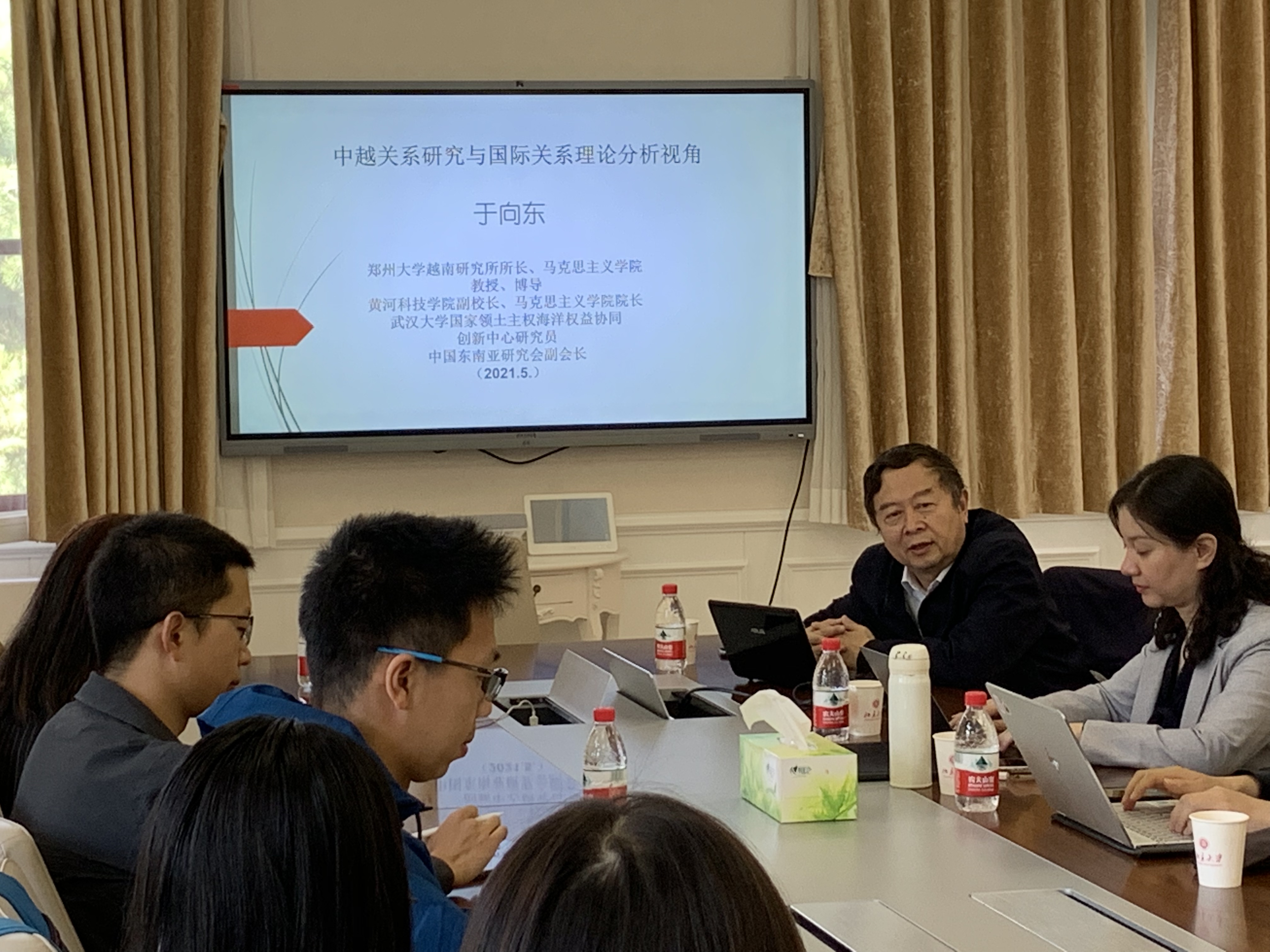 对于越南问题和中越关系的研究,于教授认为,应将中越关系研究与历史唯物主义紧密相连,准确把握中越关系,分清主流与支流,不能否认或隔断歪曲历史,并强调要开展跨学科、跨领域的综合性研究。于向东教授把中越关系研究中的一些问题放在国际关系理论和分析方法的框架下进行解读,例如从威斯特伐利亚体系与宗藩体系看中越关系,用“不对称性理论”去解读越南对中国的应对模式等。最后,于向东教授总结了越南研究相关理论和分析方法,指出越南研究实质上也是一种跨学科综合性研究,需要各学科领域的丰富知识和跨学科研究方法。于向东教授的报告既有理论高度,又有对越南和中越关系研究具体问题的分析和解读,同时还结合自己多年学术研究心得以及在越访学工作多年的经验,为在座师生提供了很多有益的启发,使大家对中越关系基本问题与理论分析框架有了更清晰的把握。