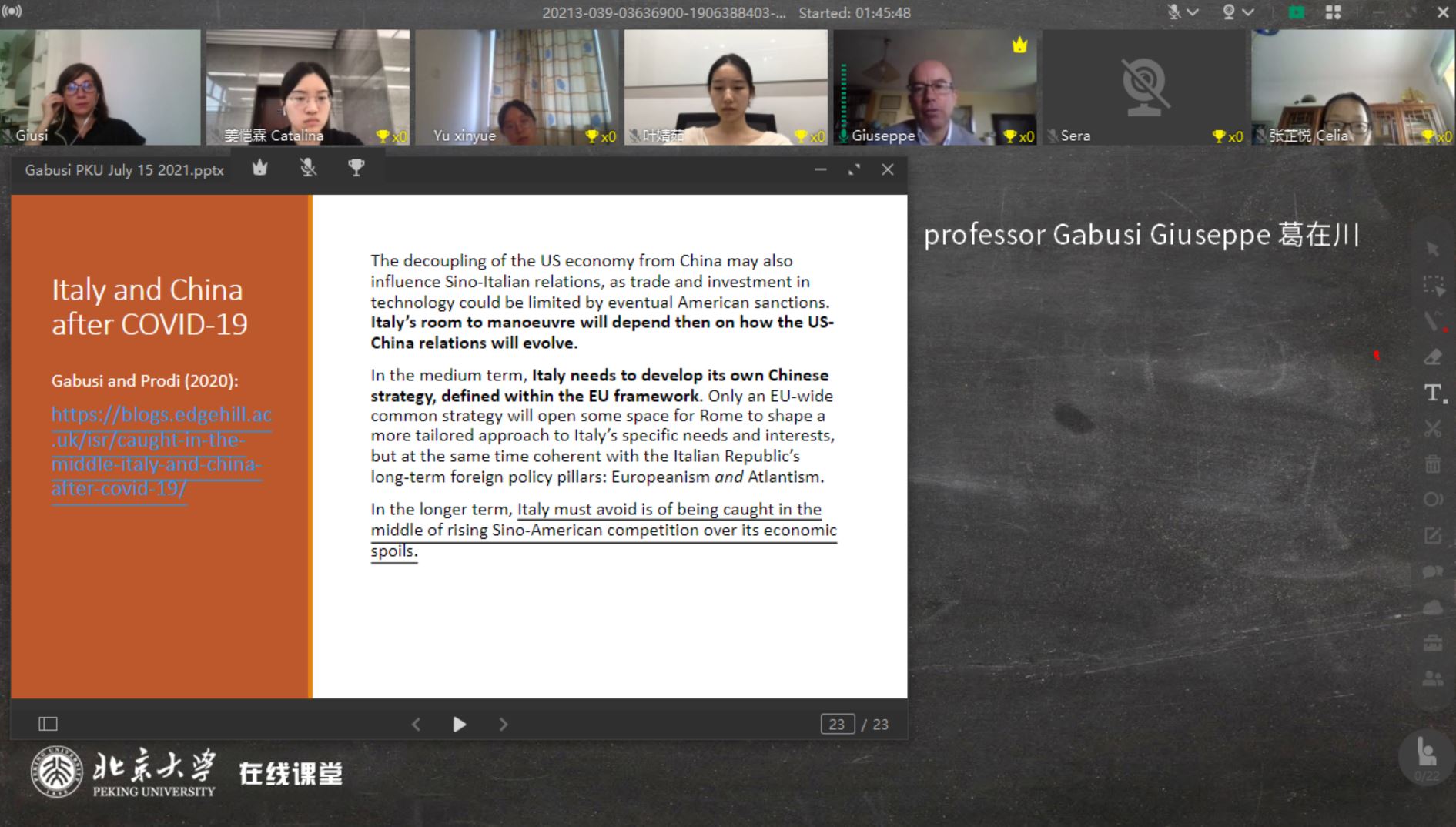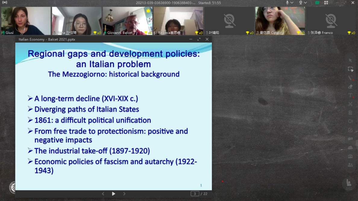 本次暑期课得到了德赢vwin体育官网地中海区域研究中心及意大利都灵大学的学术支持。来自都灵大学经济与统计系、文化政治与社会学系的Giovanni Balcet、Luca Storti、Giuseppe Gabusi、Andrea Pritoni等4位教授分别以“全球视野中的意大利经济”、“意大利社会:新旧谜题”、“意大利外交政策”、“意大利政治制度介绍”为题,举行了专题研讨。