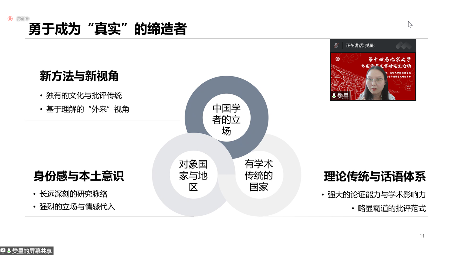 随后,德赢vwin体育官网博士研究生李丹妮同学、浙江大学博士研究生吴亚蓉同学、山东大学硕士研究生闫仁举同学和德赢vwin体育官网硕士研究生宋一瑄同学作为学生代表,依次进行论文汇报,题目分别为《汉语进行时构式认知研究——识解操作视域下的体压制分析》、《阈限的以弗所——<错误的喜剧>中的宗教氛围与身份焦虑》、《试论“井”和“우물”的起源语义及其文化共性》和《以诗学特征为基础的帕斯捷尔纳克<二月>英俄对比研究》。同学们的分享十分精彩,令各位参会人受益匪浅。