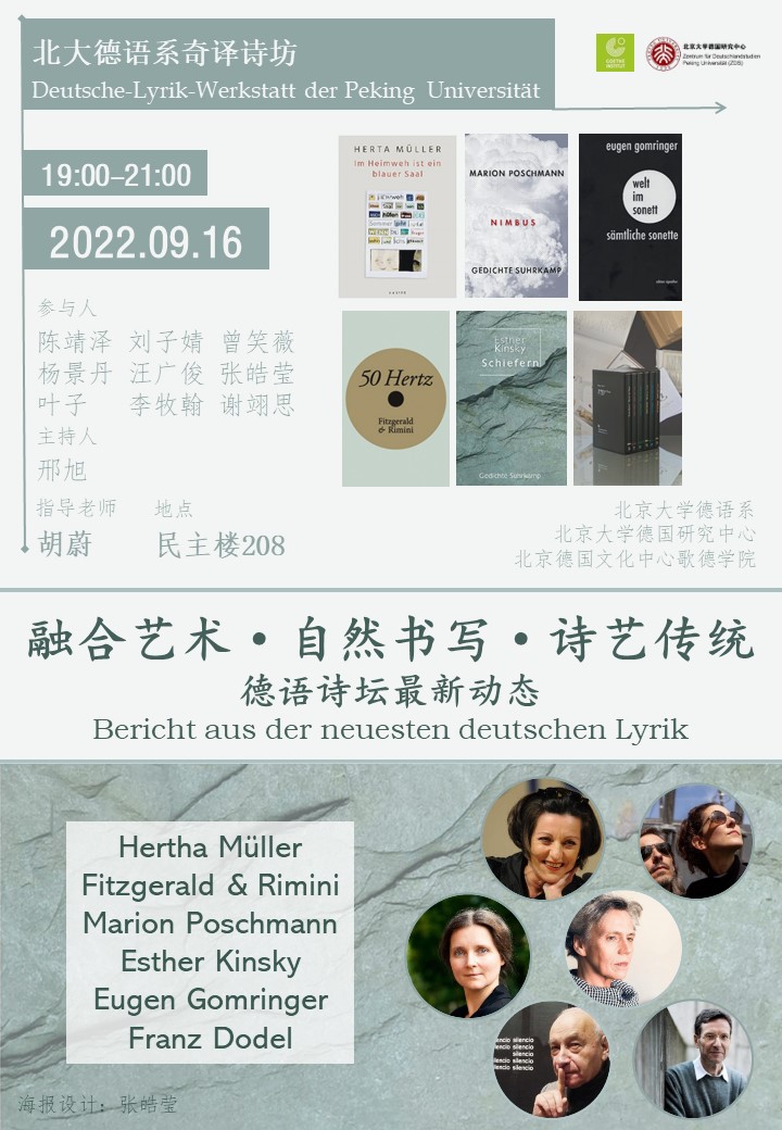 2022年9月16日晚,由德赢vwin体育官网德语系主办,北京德国文化中心歌德学院和德赢vwin体育官网德国研究中心参与共同组织的最新德语诗歌分享会“融合艺术·自然书写·诗艺传统”奇译诗坊在德赢vwin体育官网民主楼208会议室成功举行。
