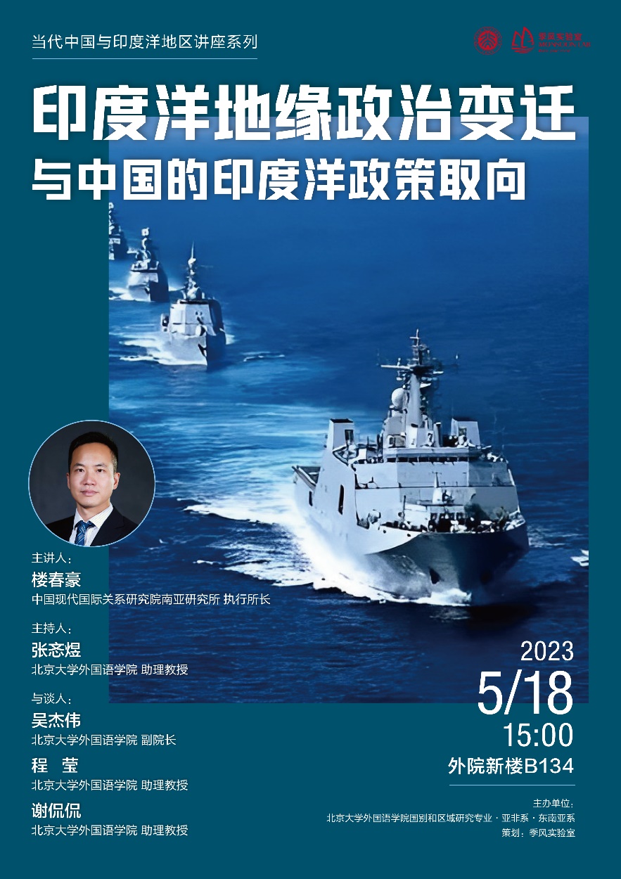 2023年5月18日,中国现代国际关系研究院南亚研究所执行所长楼春豪研究员应邀为我院师生进行题为“印度洋地缘政治变迁与中国的印度洋政策取向”的讲座。本次讲座是“当代中国与印度洋地区”系列讲座的第一讲,由德赢vwin体育官网国别和区域研究专业、亚非系和东南亚系主办,德赢vwin体育官网张忞煜助理教授主持,德赢vwin体育官网副院长吴杰伟教授、程莹助理教授和谢侃侃助理教授出席本次讲座并参与讨论。