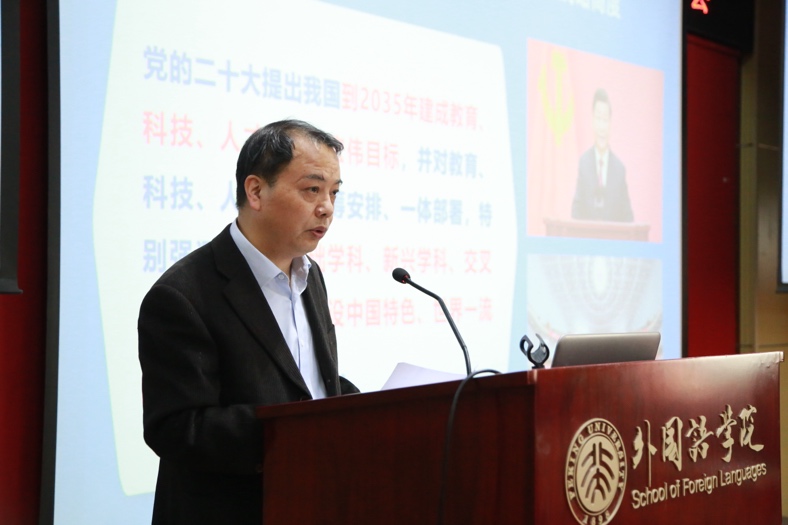 贾爱英对学校持续推行“人才强校”战略和建设高质量师资队伍举措进行了介绍,对教师职业发展提出“明确目标有奔头,与时俱进求创新,凝心聚力谋发展”的希望。刘建波介绍了2024版本科培养方案修订与教学改革相关工作,强调构建前瞻性本科课程体系、实现高质量自主培养。刘柯就研究生培养与管理相关工作的改革与发展进行了介绍,强调着力构建拔尖人才综合培养体系。林丰民对德赢vwin体育官网外语学科发展状况进行了分析,强调推进文科科研高质量发展。