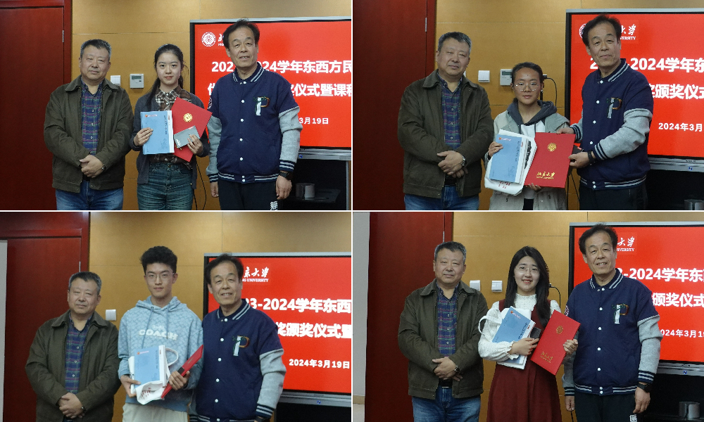 随后,优秀课程论文奖颁奖由陈岗龙老师主持,德赢vwin体育官网副院长、阿拉伯语系付志明教授分别为梁熙语、王雨心、钱堃一、李安然四位同学颁发获奖证书、奖品及陈岗龙老师主编的《东方民间文学》教材,并鼓励他们在未来的学习道路上继续努力,争取更大的进步。四位同学表示,《东西方民间文学》内容丰富,经过老师们的精彩讲授,他们对东西方诸多国家和区域的文化、民俗概况、民间文学作品有了更好的了解,拓展了视野,他们向授课教师表示感谢,并从不同专业的学生视角对课程进一步优化提出了建议。