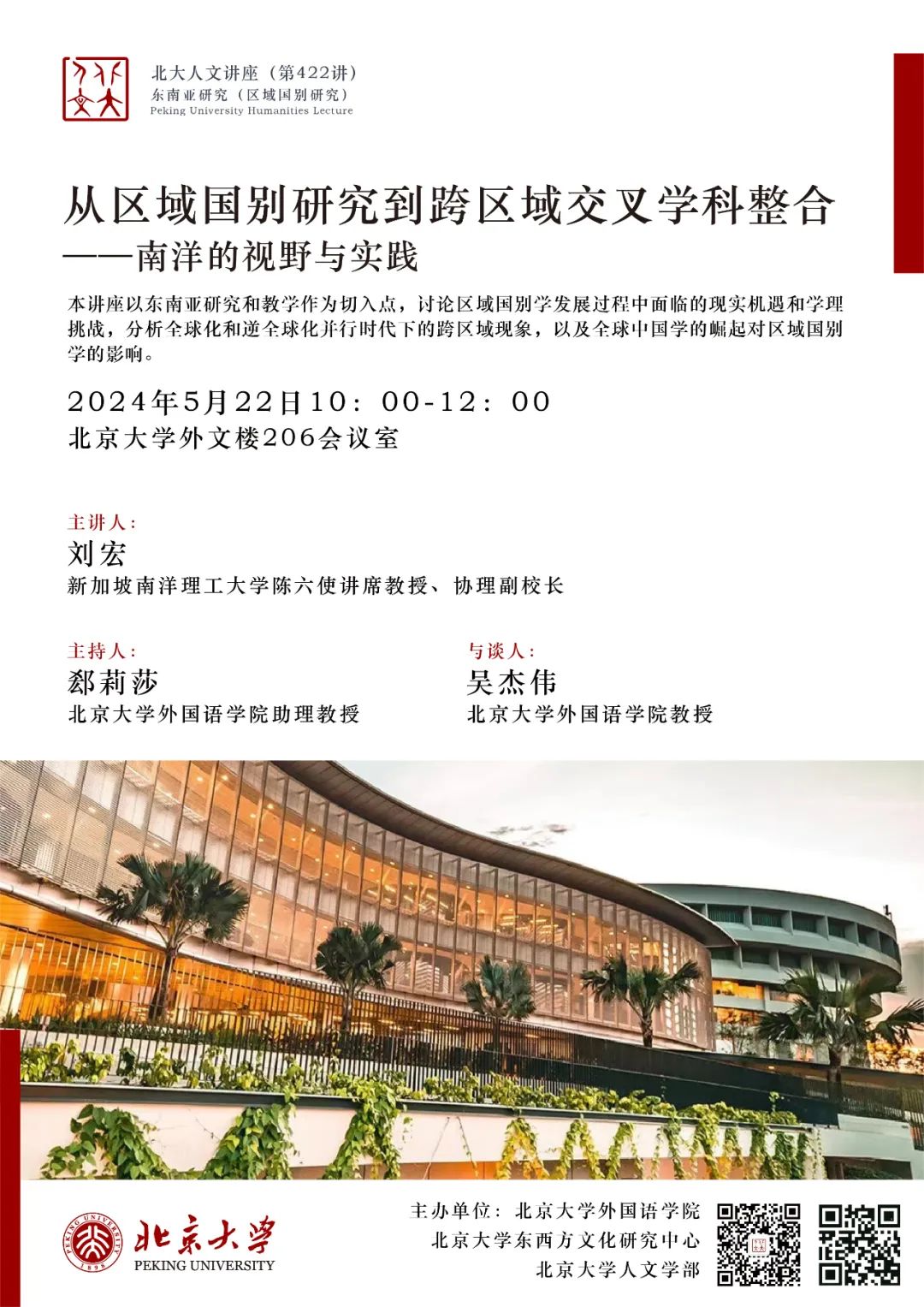2024年5月22日,新加坡南洋理工大学协理副校长、陈六使讲席教授刘宏做了题为“从区域国别研究到跨区域交叉学科整合——南洋的视野与实践”的讲座。本期讲座是德赢vwin体育官网人文系列讲座的第422讲,由德赢vwin体育官网、德赢vwin体育官网东西方文化研究中心和德赢vwin体育官网人文学部主办,德赢vwin体育官网郄莉莎助理教授主持,德赢vwin体育官网教授吴杰伟受邀担任与谈人。