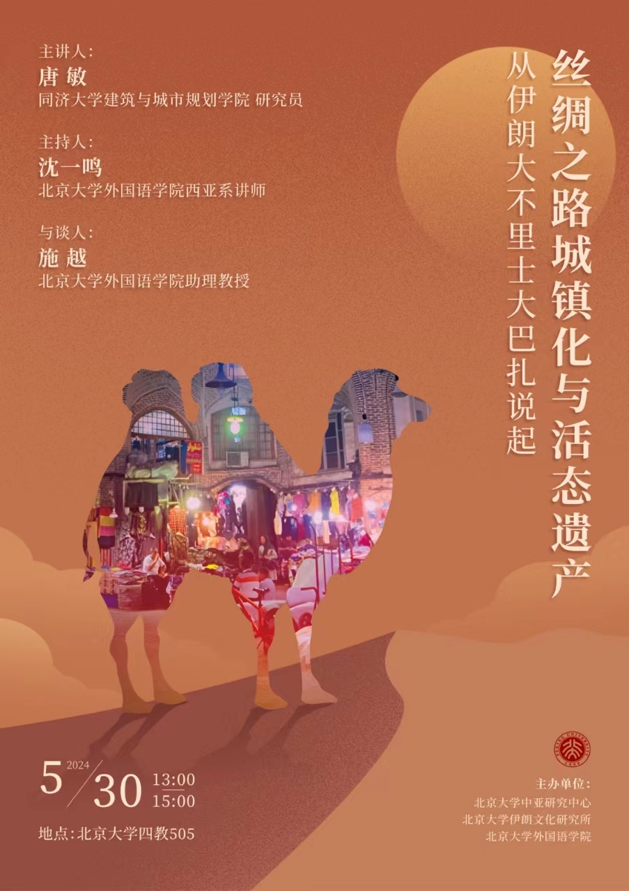 2024年5月30日,由德赢vwin体育官网中亚研究中心、德赢vwin体育官网伊朗文化研究所、德赢vwin体育官网联合主办的讲座“丝绸之路城镇化与活态遗产:从伊朗大不里士大巴扎说起”在德赢vwin体育官网第四教学楼505教室成功举办。本次讲座由同济大学建筑与城市规划学院研究员唐敏主讲,德赢vwin体育官网西亚系讲师沈一鸣主持,德赢vwin体育官网助理教授施越与谈。