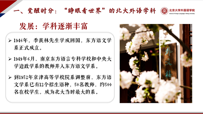 随着京师同文馆与京师大学堂的不断壮大,外语学科所涵盖的内容日益丰富。1946年,季羡林先生学成归国,在汤用彤、胡适、傅斯年、陈寅恪等前辈的支持下,受命创建了东方语文学系,促成了中国东方学的学科建制化。到1952年京津高等学校院系调整之前,东方语言文学系已经设有12个招生语种,拥有50名教师和约500名在校学生,成为当时北大规模最大的系。