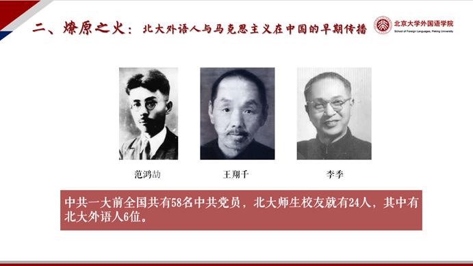 在“燎原之火:北大外语人与马克思主义在中国的早期传播”篇章,陈明分享了北大外语人在中国早期马克思主义传播中的重要贡献。他列举了王复生、李梅羹、范鸿劼、李季、王翔千、张西曼等多位北大外语人积极参与马克思主义传播与实践的事例,强调了他们的影响力和激励作用。