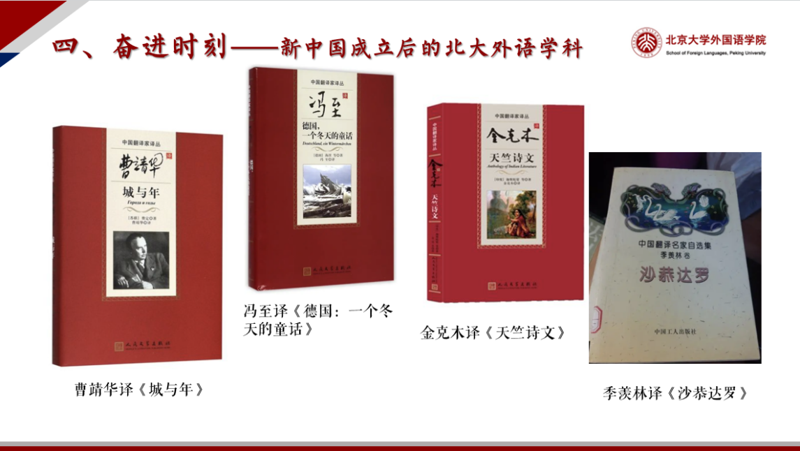 “奋进时刻——新中国成立后的北大外语学科”篇章概述了新中国成立后,北大外语学科的发展历程以及在培养非通用语种人才和外交官方面的贡献。以曹靖华、冯至、金克木、季羡林等为代表的一批北大学者和翻译家翻译了大量优秀的东西方文学作品,产生了十分深远的影响,一度引导了整个中国的阅读习惯和精神生活,影响了中国几代人的世界观和价值观。外语学科中的翻译研究,作为北大学科的重要组成部分,不仅推动了学术发展,也提升了北大在国内外学术界的影响力。
