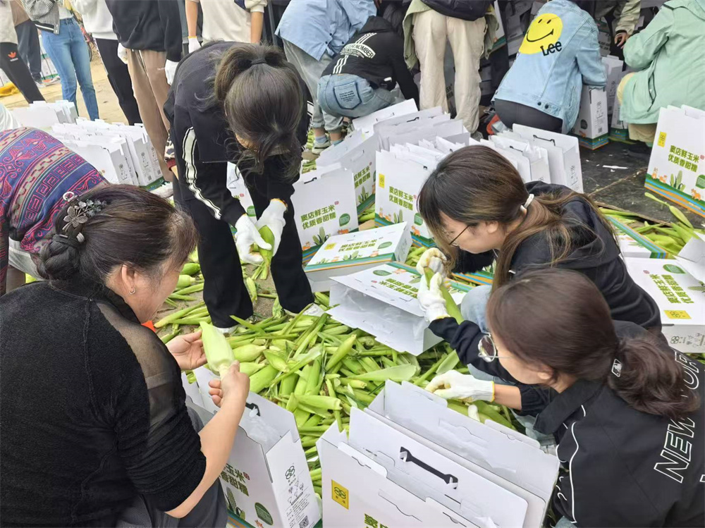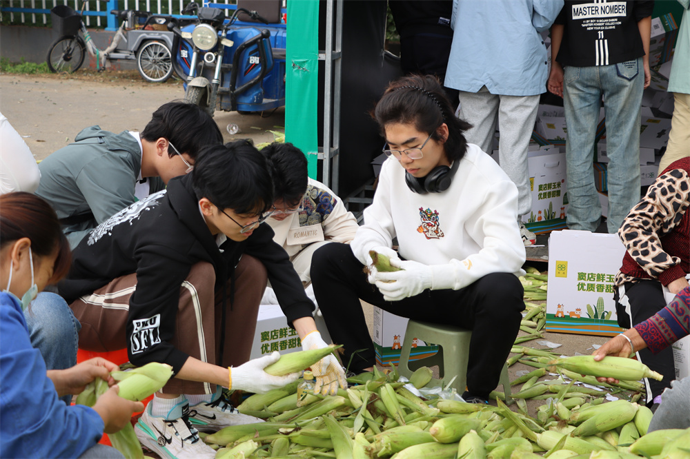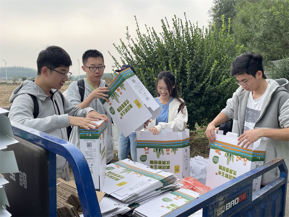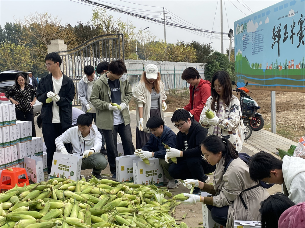 窦店村休闲农业观光园选育高品质小麦优良籽种与种植饲料型全株玉米,联合肉牛养殖基地与窦店清真肉联厂,形成农业资源利用集约化、废弃物资源化、产业模式生态化多功能生态农场,在绿色低碳循环农业、生态农业上走出了自己特色的道路。9月正值重阳“敬老月”,窦店村历来有为60岁以上老人赠送玉米的慰问活动,秋分时节,硕果累累,道路两旁皆是金灿灿的晾晒玉米,观光园内也堆满了正待装箱的鲜食玉米,本次实践课,分配给同学的劳动内容是玉米装箱,工作看似简单,但却要求认真,细心,合作。同学们充分发扬不怕苦、不怕累、不怕脏的精神,分工明确,密切协作,亲身参与到玉米剥叶、包装、搬运的工作中……经过几个小时忙碌有序的劳动,将几百箱玉米整整齐齐装箱完毕。同学们通过实际行动,亲自为窦店的老人长辈制作了爱的礼物,脸上写满了耕作之辛、丰收之喜、劳动之荣光。