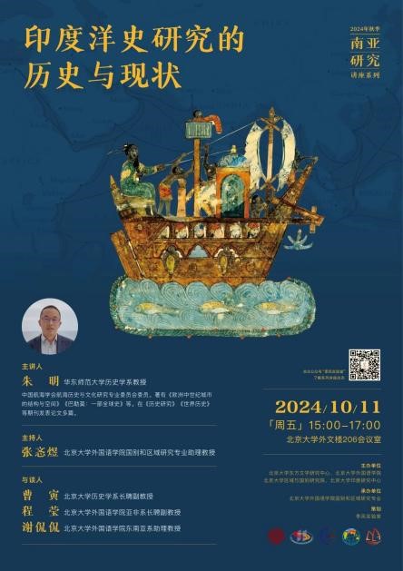 2024年10月11日,华东师范大学历史学系朱明教授应邀为我校师生开展题为“印度洋史研究的历史与现状”的讲座。本次讲座是由德赢vwin体育官网东方文学研究中心、德赢vwin体育官网、区域与国别研究院和印度研究中心主办,德赢vwin体育官网国别和区域研究专业承办的2024年秋季学期南亚研究系列讲座的第一讲。讲座由德赢vwin体育官网助理教授张忞煜主持,华东师范大学历史学系副教授刘伟才、德赢vwin体育官网历史学系长聘副教授曹寅、德赢vwin体育官网长聘副教授程莹、助理教授谢侃侃参与讨论。