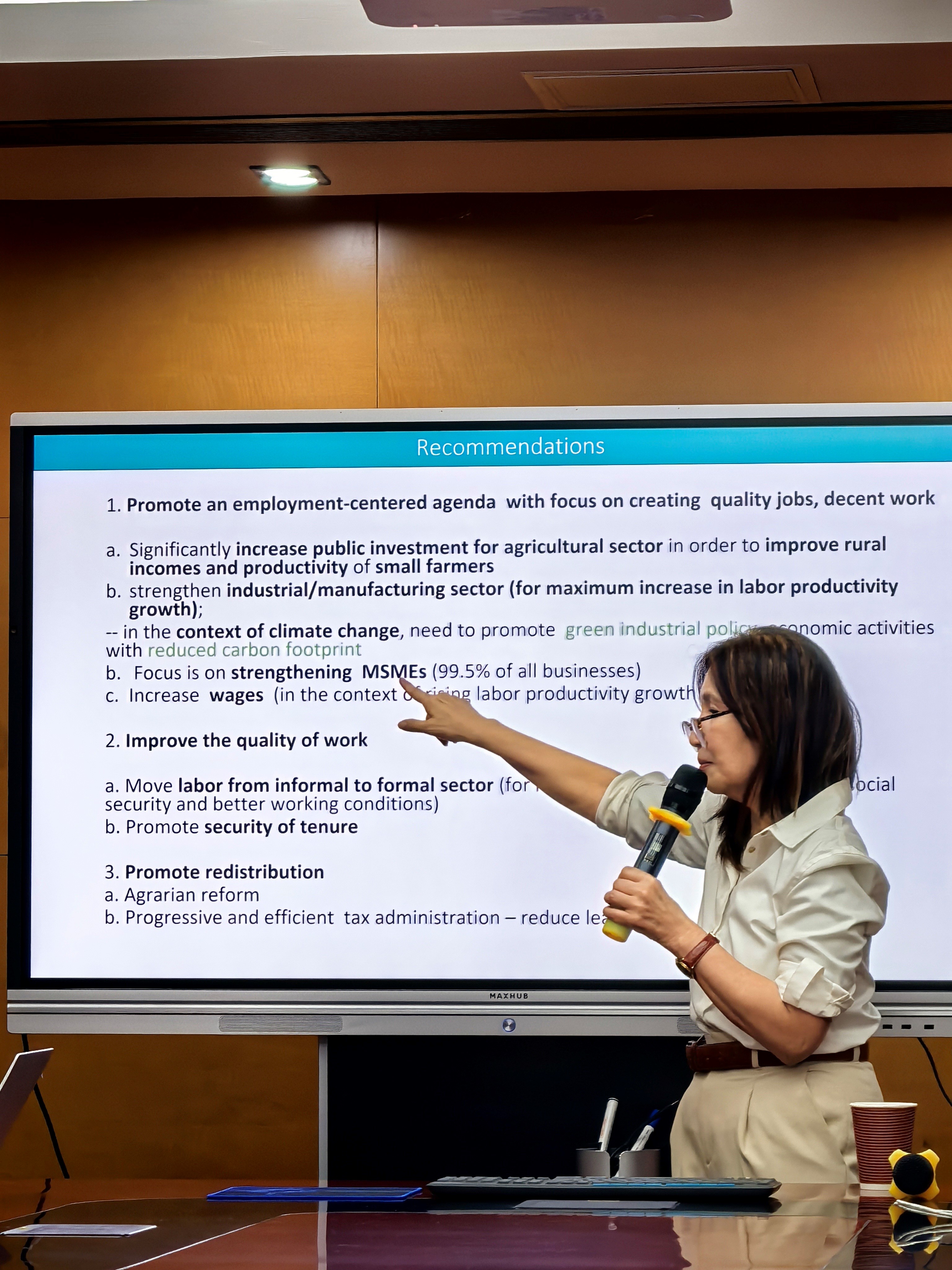 最后,拉奎萨博士指出,菲律宾政府应该扩大社会保障面;完善税收体制;推动社会保险制度发展;推广活跃劳工市场计划,以技能培训等多种方式促进就业。她呼吁政策制定者采取更加包容性和前瞻性的措施,以确保经济增长的成果惠及更广泛的社会群体。