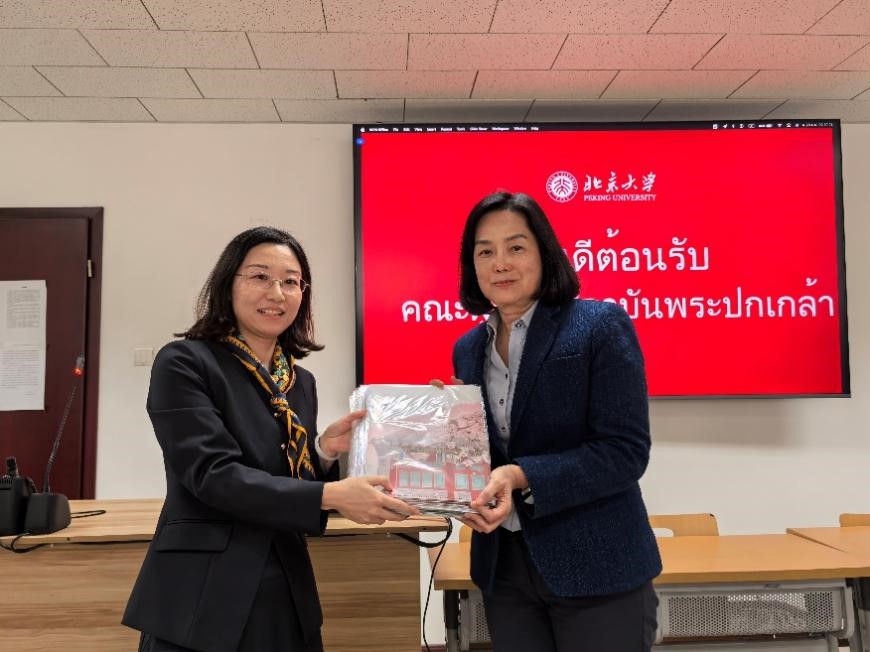 座谈会在外院新楼B135室举行,由泰语专业研究生熊珊儿担任主持人。熊燃老师首先代表北大泰语专业向泰国七世王学院的再次到访表示欢迎,并向来宾介绍了近年来泰语专业与泰国高校师生开展文化交流的情况。接下来,泰语专业2024级硕士生罗燕介绍了德赢vwin体育官网的历史与现状。2022级本科生代表苏煜分享了暑期赴泰国朱拉隆功大学交流实践的经历以及学习泰语的感受。随后,熊燃老师与道诺伊·素提尼帕蓬女士互赠礼品。