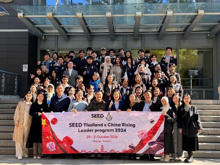 2024年10月28日上午,泰国七世王学院代表团一行36人到访德赢vwin体育官网,与泰语专业师生见面交流。本次七世王学院代表团由七世王学院基金会主席兼泰国总理府副秘书长波汶萨·伍万诺(Borwornsak Uwanno)带领,随行人员包括上议院经济货币和财政委员会顾问甘诺·塔纳巴文(Kannop Thanapakpawin)、七世王学院委员会委员道诺伊·素提尼帕蓬(Daonoi Suttiniphapunt),25名学生代表及8名工作人员。德赢vwin体育官网东南亚系薄文泽教授、副系主任金勇长聘副教授、泰语教研室主任熊燃助理教授、国际合作部海外推广办公室资深项目官员蒲清老师,和泰语专业全体本科及研究生同学共同参加了座谈交流。