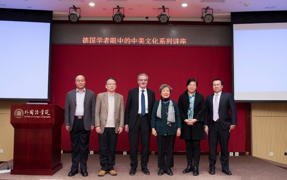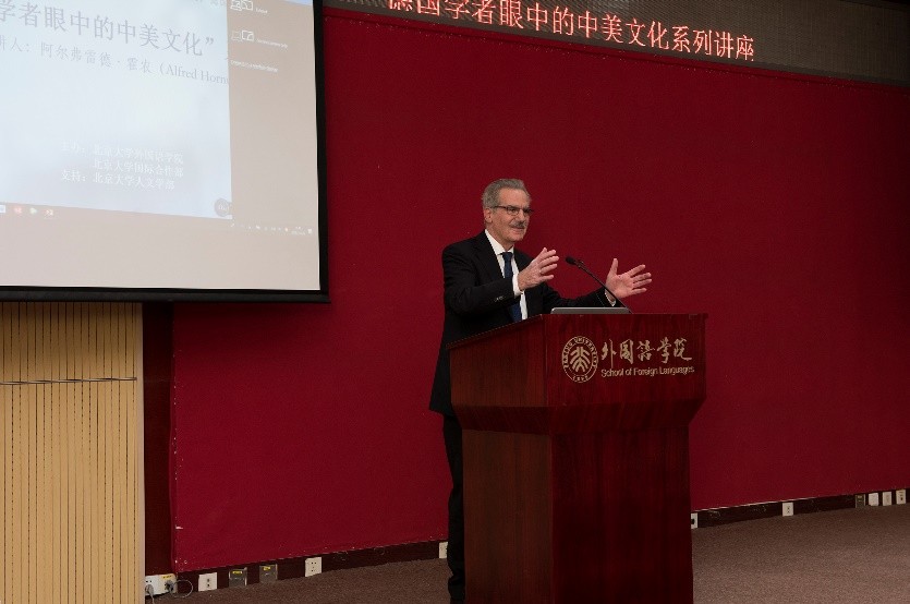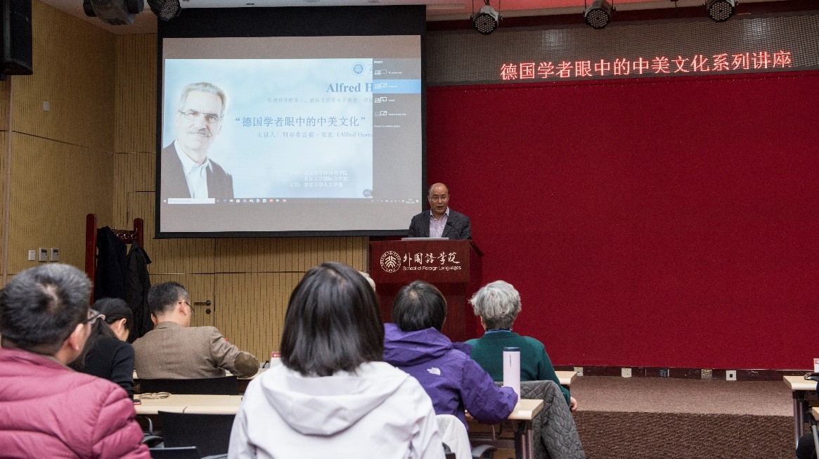 金秋十月,燕园层林尽染,硕果累累。2018年10月26日至28日,在德赢vwin体育官网人文学部的鼎力支持下,德赢vwin体育官网与国际合作部联合举办高端学术讲学计划,特邀欧洲科学院院士阿尔弗雷德•霍农(Alfred Hornung)教授做了题为“德国学者眼中的中美文化”的系列讲座。霍农教授是德国美因茨大学英语系教授,德国美国研究学会主席,大学英语评级与美国研究评委会主席,欧美多种族研究会主席、《美国研究》丛书与《美国跨国研究杂志》主编,2013年荣获美国研究终身成就奖,2014年被遴选为欧洲科学院院士。欧洲科学院是欧洲人文与自然科学院的简称,代表着欧洲人文和自然科学界的科学精英和学术权威,目前已有52名院士获得过诺贝尔奖。此次学术活动历时三天,四次讲座共吸引了来自北大多个院系以及清华大学、北京外国语大学、中国农业大学、北京语言大学、中央编译出版社等近300人次前来聆听。