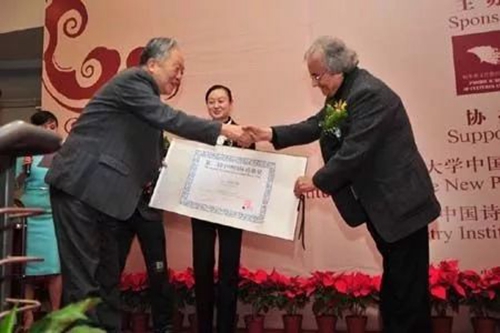 仲跻昆于德赢vwin体育官网,在第二届中坤国际诗歌奖颁奖典礼上为阿拉伯当代著名诗人阿多尼斯颁奖