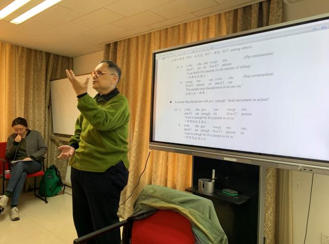 4月19日上午,台湾清华大学语言学研究所蔡维天教授应德赢vwin体育官网外国语言学及应用语言学研究所邀请,在德赢vwin体育官网新楼401进行了题为“乾坤句中的中心语移位(On Head Movement in Flip-flop Sentences)”的学术沙龙讲座。来自德赢vwin体育官网不同院系以及清华大学、北京语言大学、社科院等院校的师生五十余人到场聆听。本场讲座由语言所助理教授胡旭辉老师主持。